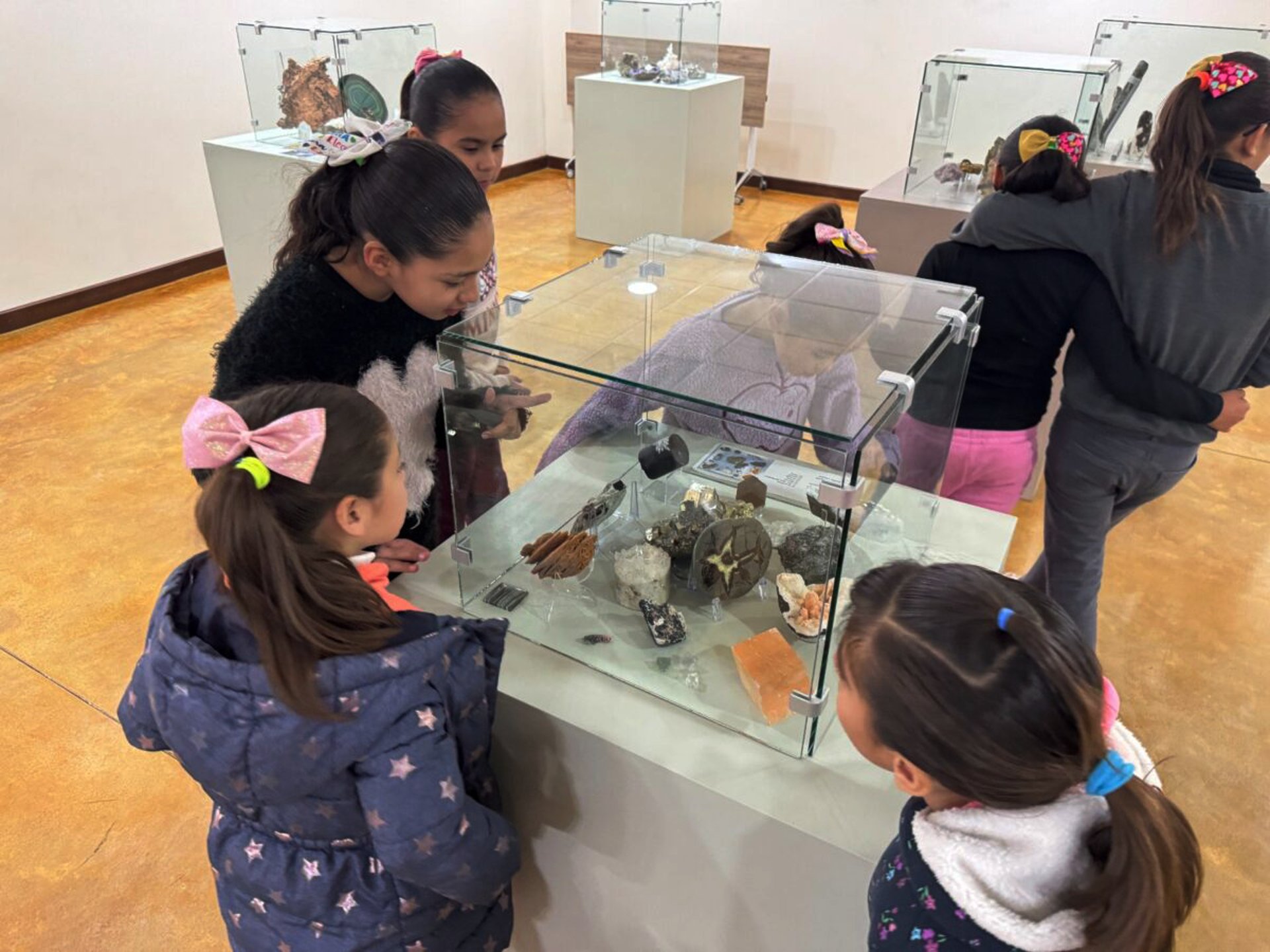 En la Exposición de Minerales, los niños pueden apreciar una colección de ejemplares exhibidos en vitrinas. Se presentan minerales cristalizados correspondientes a los 10 minerales estudiados en el curso, junto con otras piezas que muestran la diversidad de formas, colores y texturas de la naturaleza. Esta área permite observar de cerca la belleza de los minerales y reconocer su importancia tanto científica como cultural.