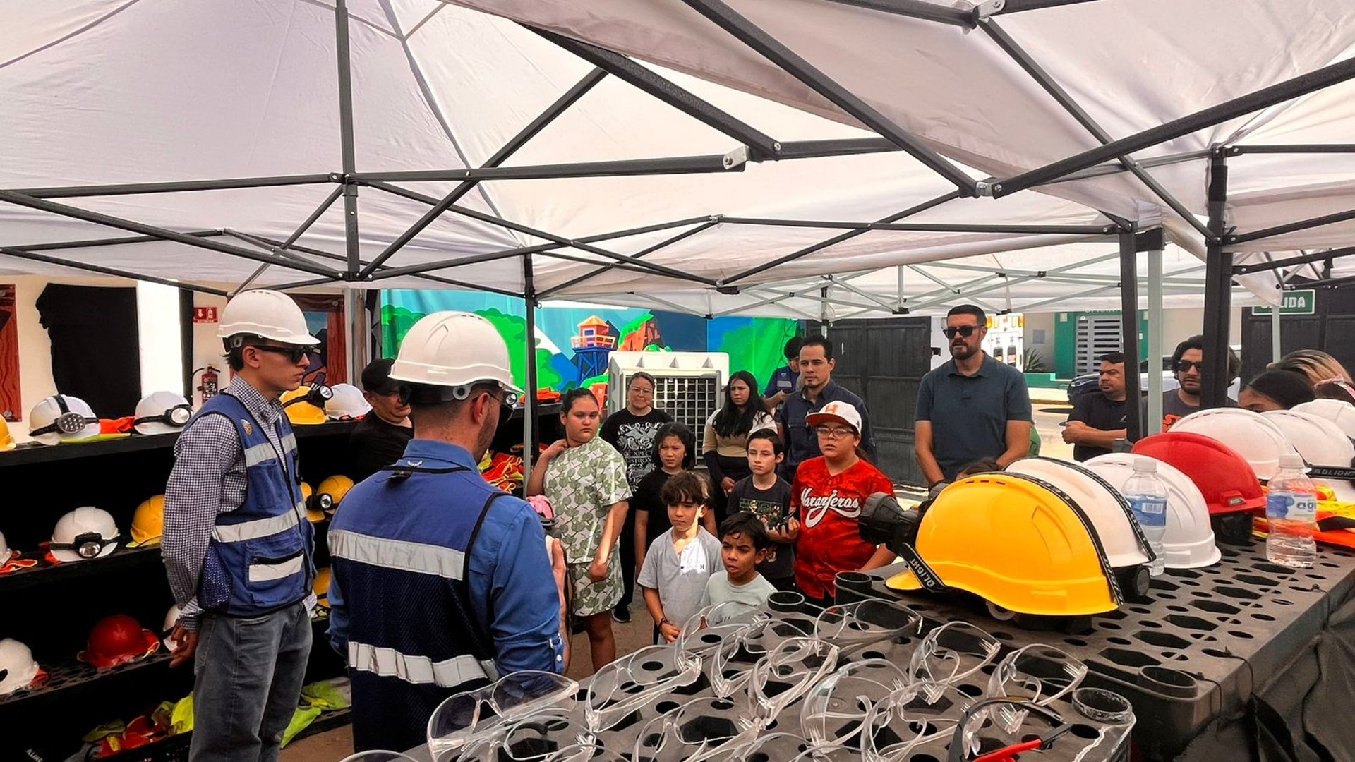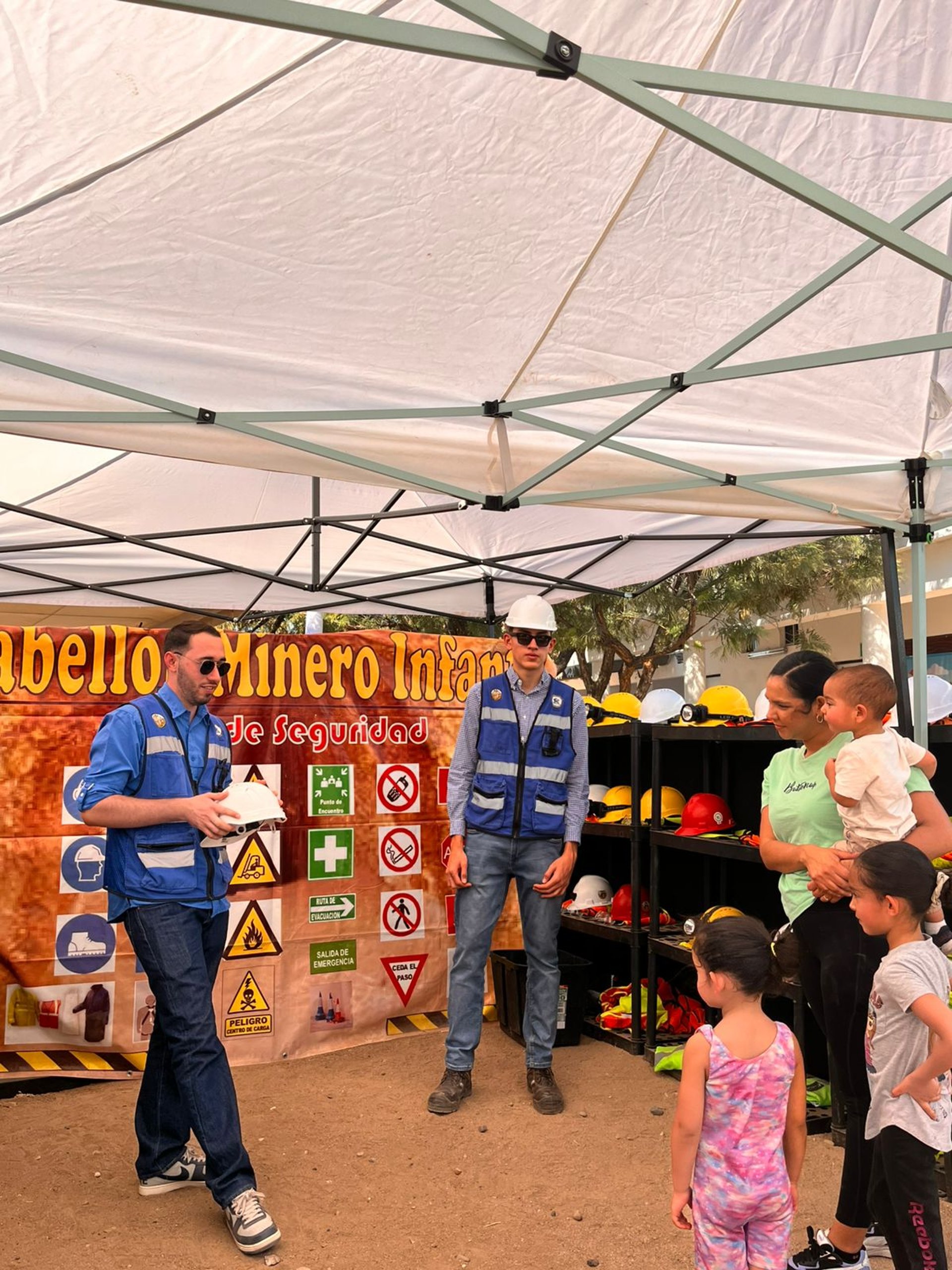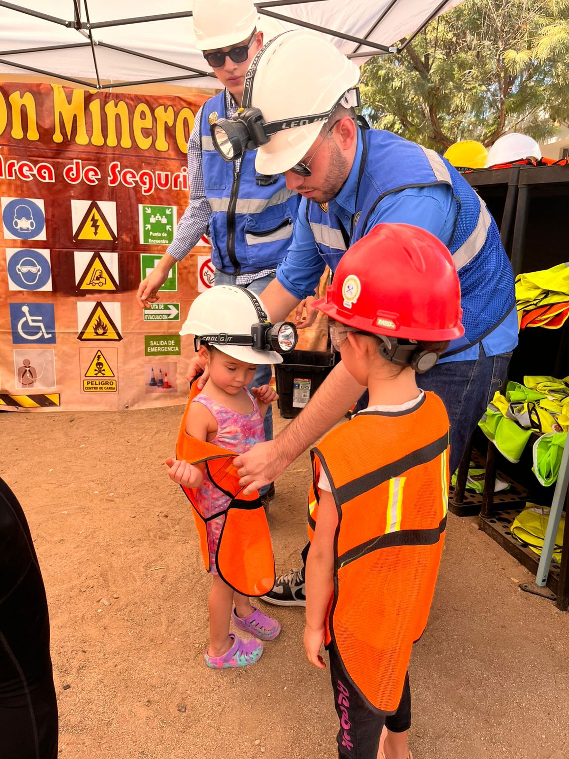 En el Área de Seguridad, los niños aprenden la importancia de protegerse en la minería, tanto superficial como subterránea. Aquí conocen el uso del equipo de protección personal —chalecos, cascos y lentes— y el significado de la señalética de seguridad. Mediante un espacio interactivo, los participantes se familiarizan con las reglas básicas para cuidarse y cuidar a los demás.