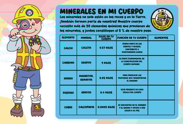 En Los minerales en mi cuerpo, los niños aprenden que los minerales no solo están en la tierra, sino también dentro de nosotros. Elementos como el calcio, el hierro o el potasio forman parte esencial de nuestro organismo y son indispensables para mantenernos saludables. A través de ejemplos sencillos, se explica cómo obtenemos estos minerales mediante los alimentos y por qué son fundamentales para el crecimiento y el bienestar.
