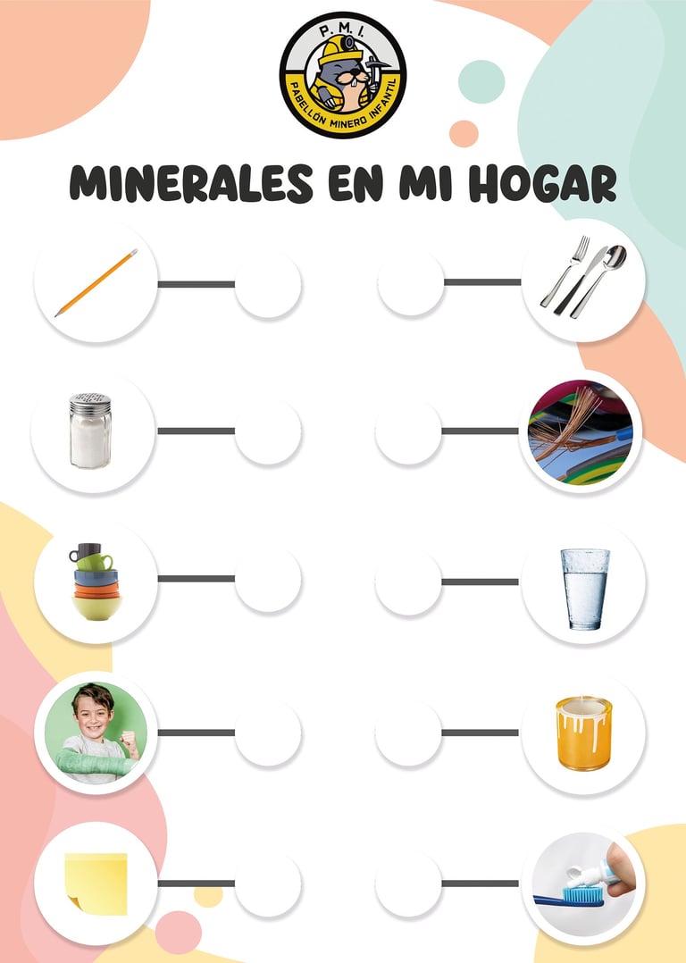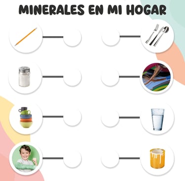 En Los minerales en mi hogar, los niños descubren la estrecha relación que existe entre los minerales y nuestra vida cotidiana. A través de ejemplos prácticos, aprenden cómo estos recursos están presentes en los objetos que usamos día a día, en la construcción de nuestros hogares y hasta en la historia de la civilización. La actividad muestra de forma sencilla y clara que los minerales no solo pertenecen a la tierra, sino que son parte esencial de nuestra vida.